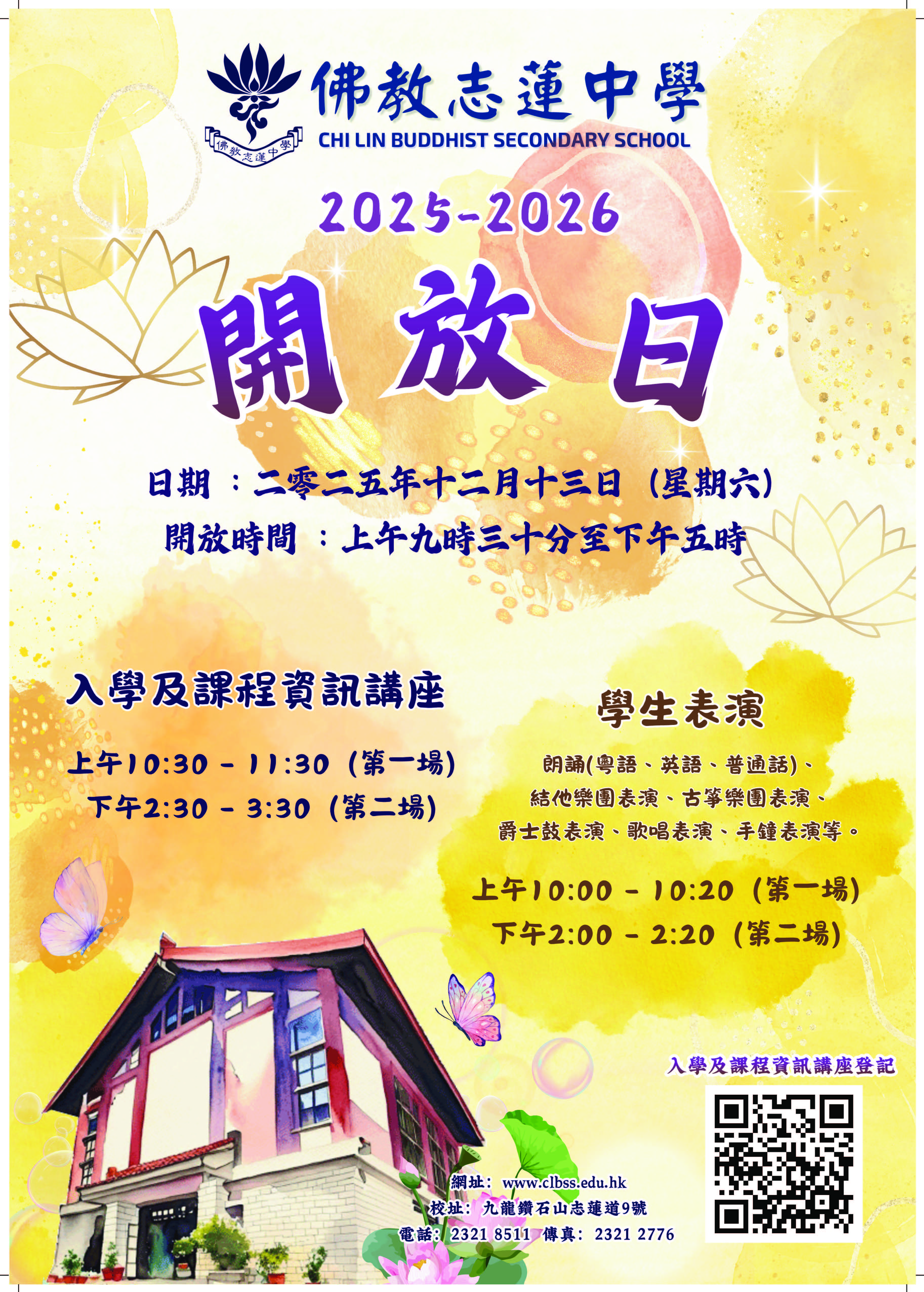 2025-12-13 本校將於12月13日(六)舉行2025-2026開放日,開放時間為上午9時30分至下午5時。當日將舉辦2場入學及課程資訊講座,有意參與的家長請掃描海報上的二維碼登記。如有任何查詢,請致電2321-8511聯絡校務處職員。 最新消息